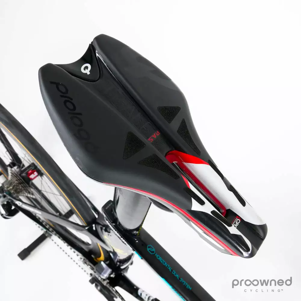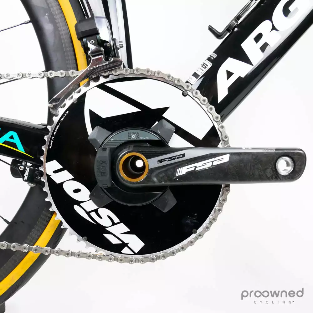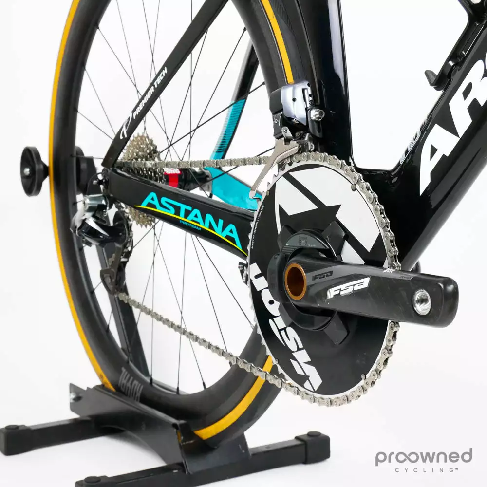 The Astana team mechanics have well maintained the bike, and our mechanics have fully restored it. The bike is equipped with a mix of top-of-the-line electronic Shimano Dura-Ace 11sp Di2 2x11sp groupset and the ultralight FSA components.