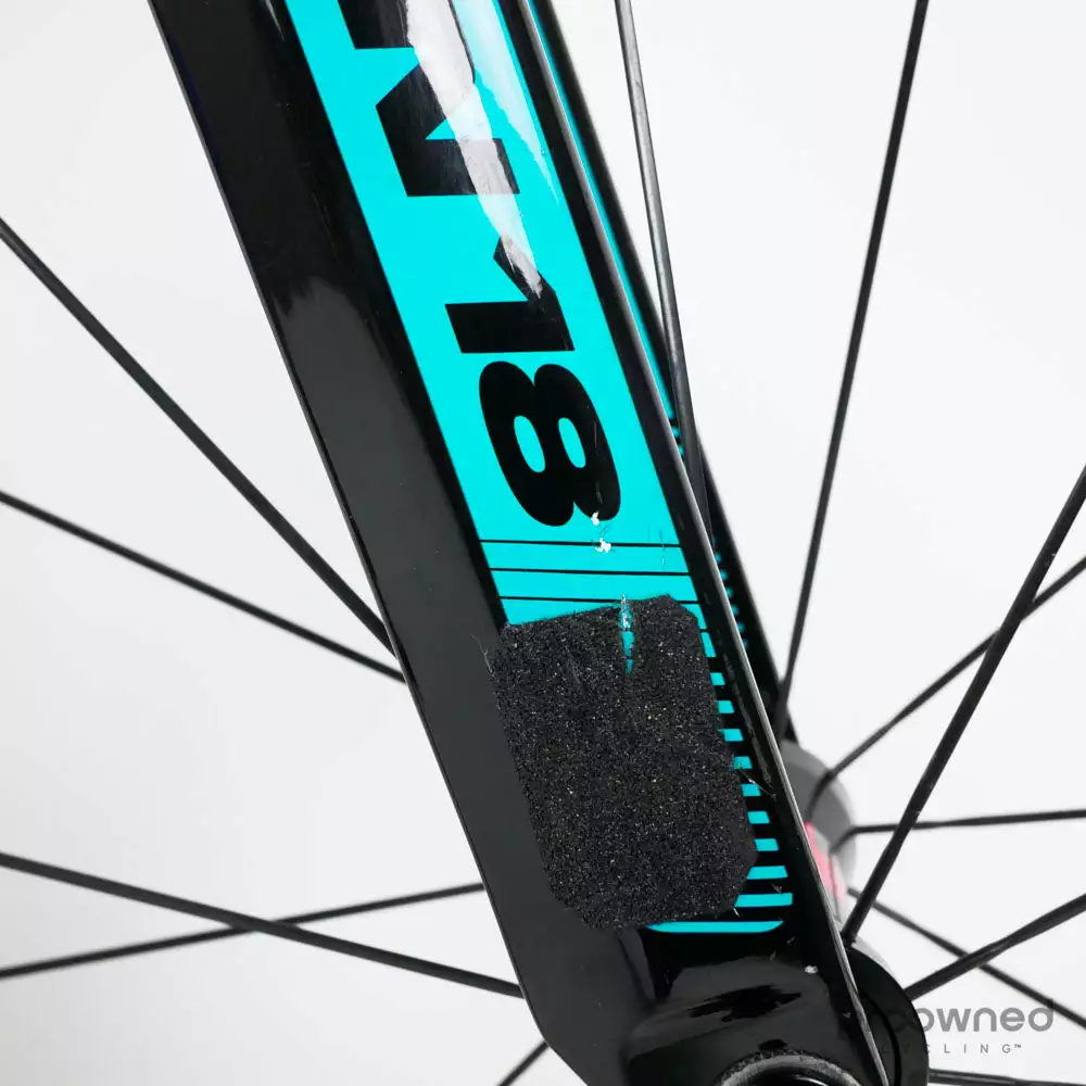 Both shifters, handlebar, fork, top tube, downtube, rear stay, chainset, chainstay, seat stay and headtube have marks and scratches.