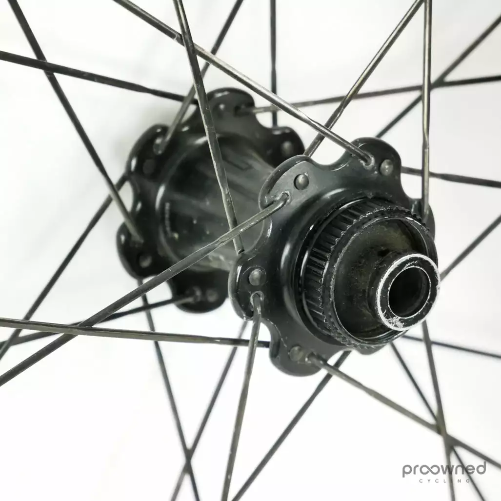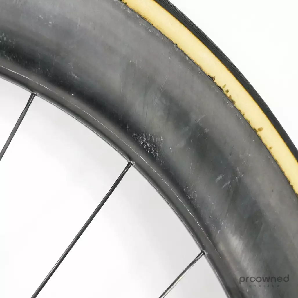 The wheel is used but only shows a few minor cosmetic scratches, nothing that affects the performance of the wheel. The wheelset is equipped with a pair of Vittoria Corsa Graphene 25mm tires. The tires are used but in good condition.