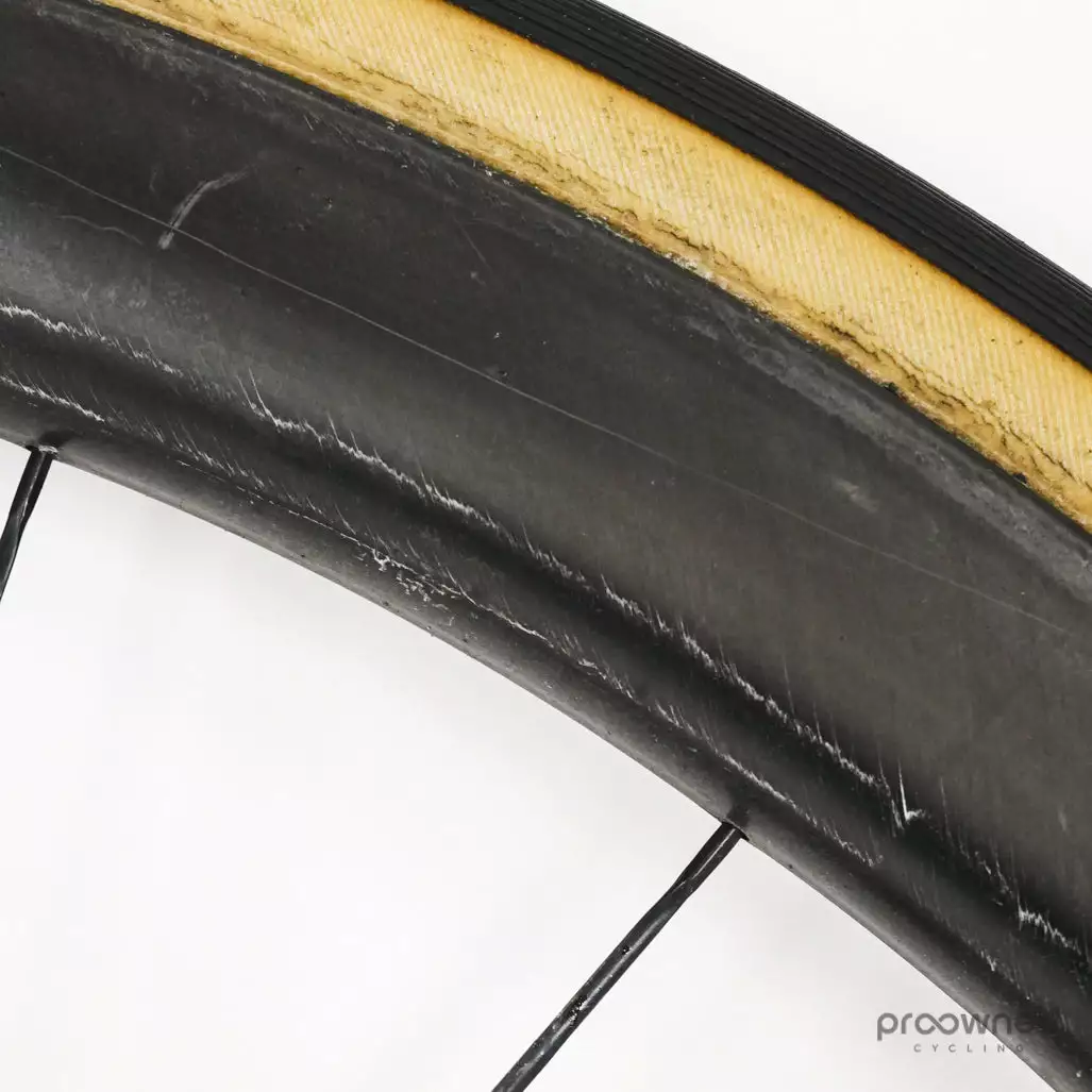 The wheel is equipped with a Vittoria Corsa Graphene 2.0 tire. The tire is used but in good condition.