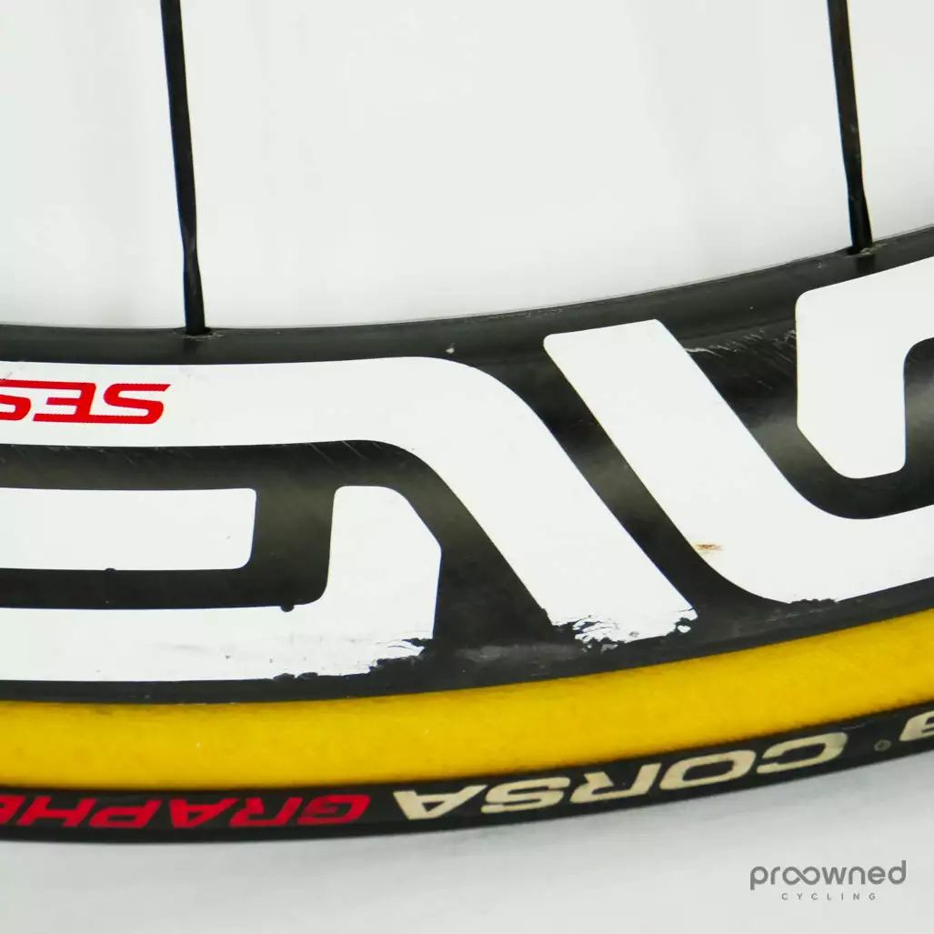 The wheels are equipped with a pair of Vittoria Corsa Graphene 2.0 tires. The tires are used but in good condition and are ready for many more miles of racing.