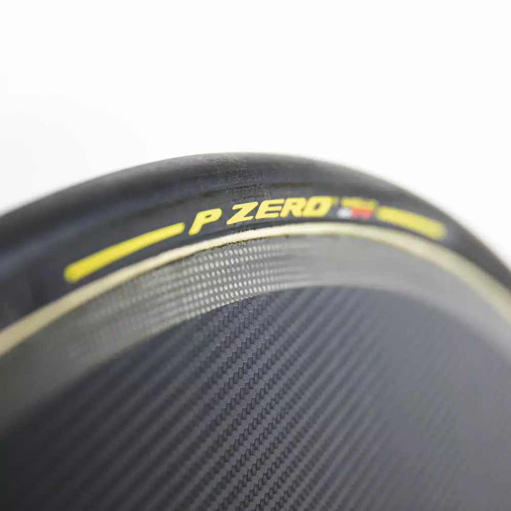 This wheel comes with Pirelli P Zero Velo TT tubular tire mounted by the team mechanics. The race-ready lightweight tire is specially designed for time trial and has a completely smooth surface for optimal grip and minimal resistance. The P Zero Velo TT is a prototype tire made for World Tour teams.
