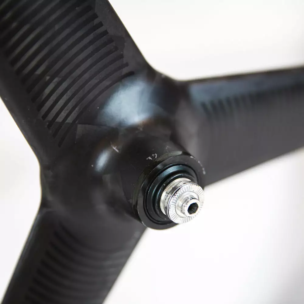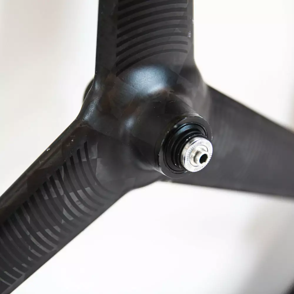 The wheel delivers reliable and smooth performance in varied conditions and can with great advantage be combined with a disc wheel, to complete an incredibly fast time trial machine. The spread tow carbon fibre construction not only looks awesome, but it is also extremely stiff and lightweight, ensuring a very low weight. The design provides minimal drag due to the 3-spoke profile, resulting in a phenomenal performance at high speeds. To prevent interrupting the airflow the valve is positioned behind one of the spokes.
