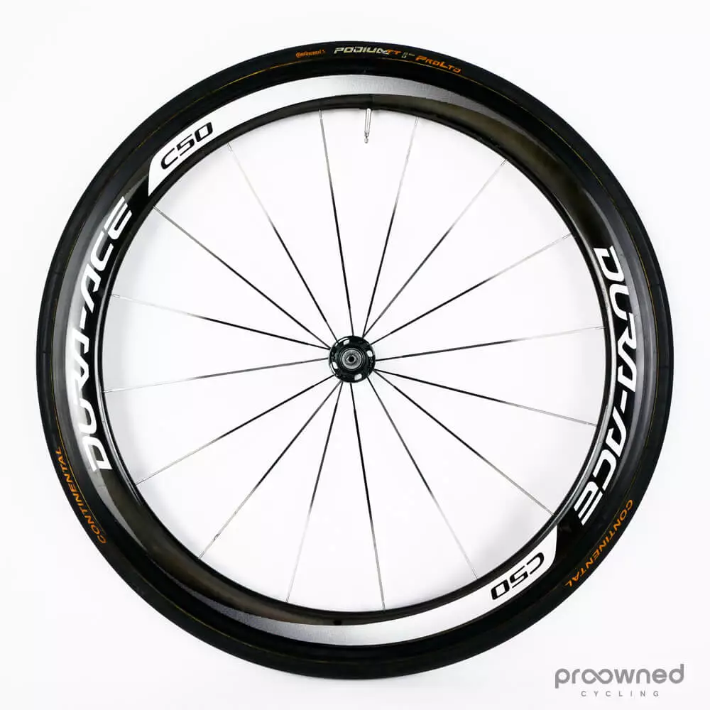 Shimano Dura-Ace C50 carbon tubular front wheel.