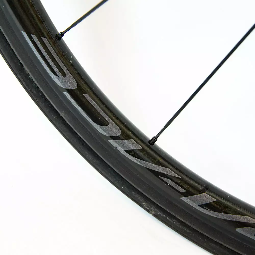 The wheelset is used. It comes with some marks from usage (mostly clearcoat). The wheels are in good condition with some scratches. The bearings are in very good condition and there are many miles left in them. The front tire is used and the rear tire is as new.