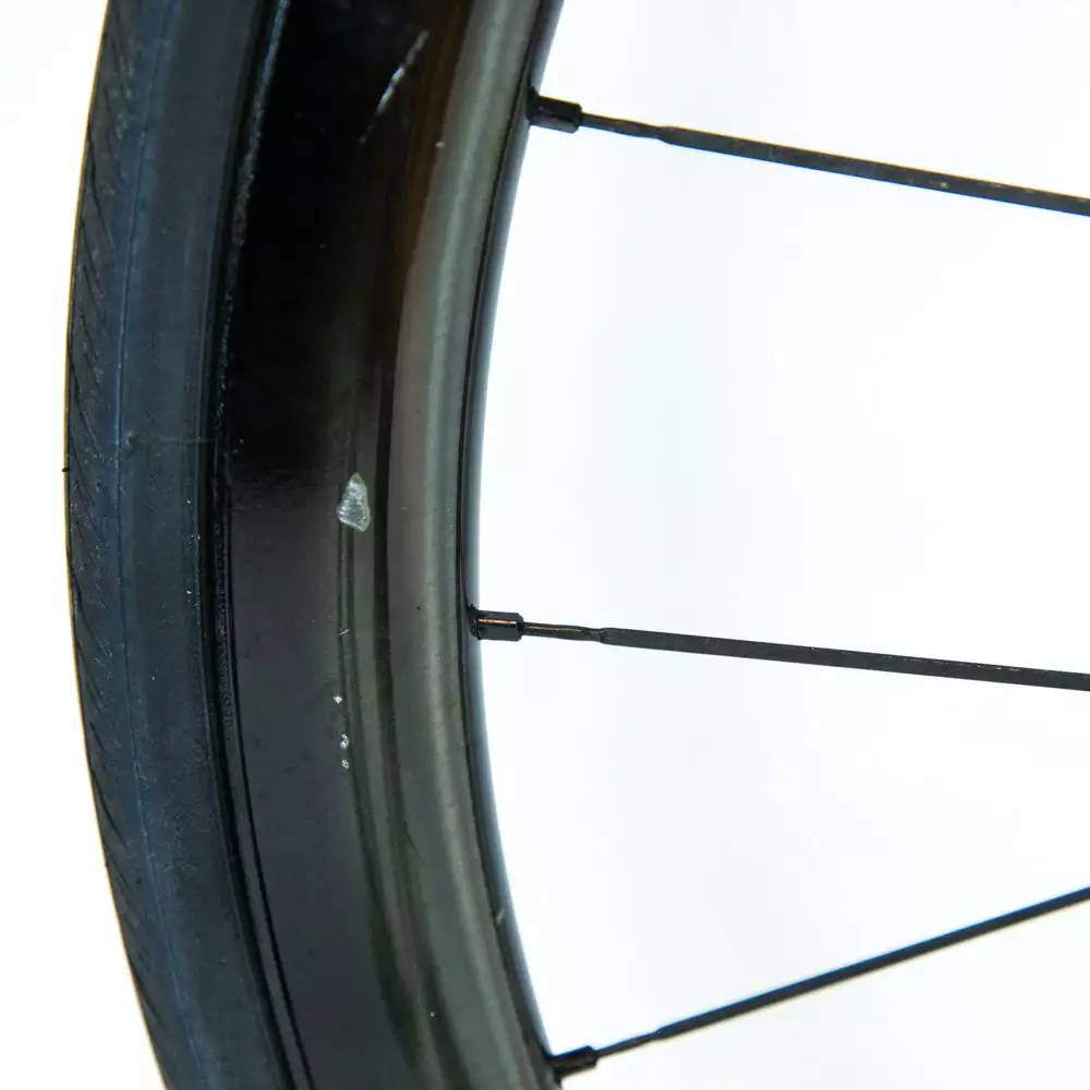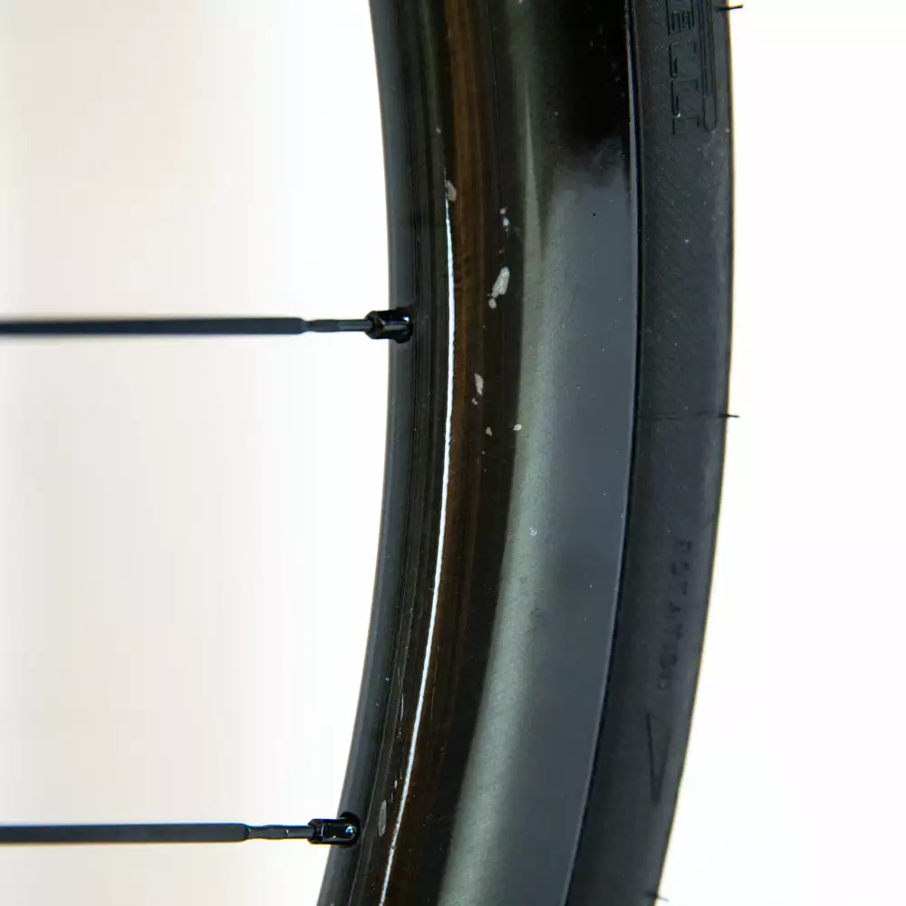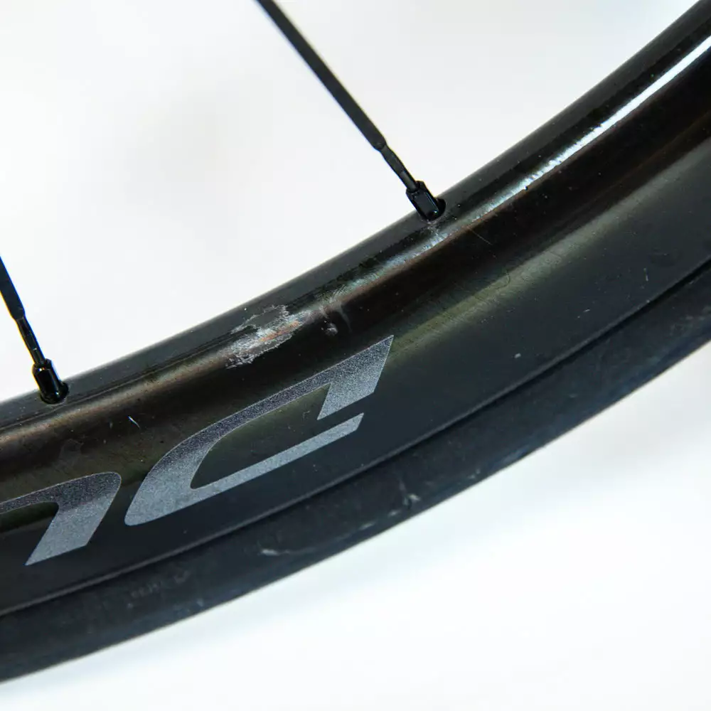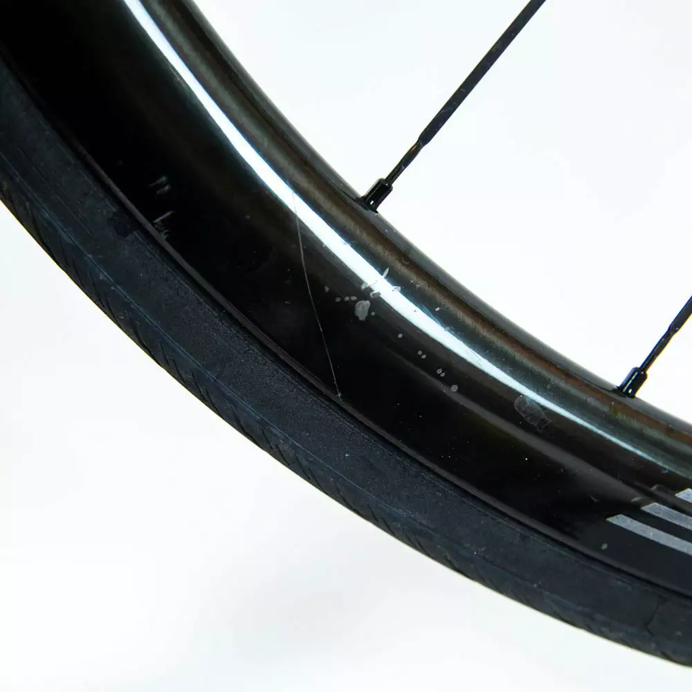 The wheelset is used. It comes with few marks from usage (small marks in clearcoat). The wheels are in good condition with few scratches. The bearings are in a decent condition and still have miles left in them. The front tire is as new and the rear tire is used.