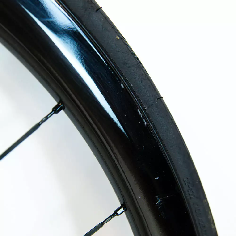 This wheelset comes with a Pirelli P Zero Velo 4S front tire and a Pirelli P Zero Race TLR rear tire.