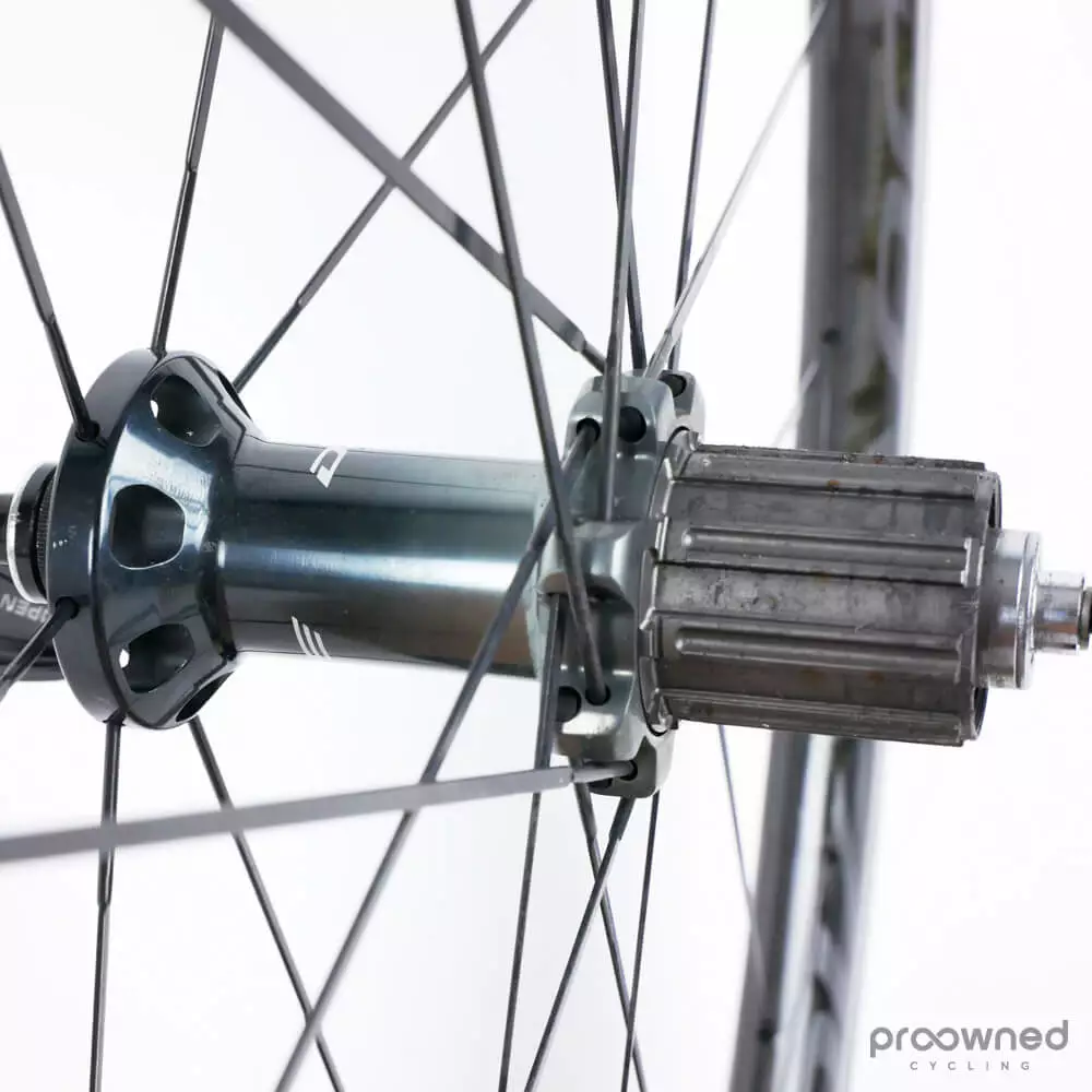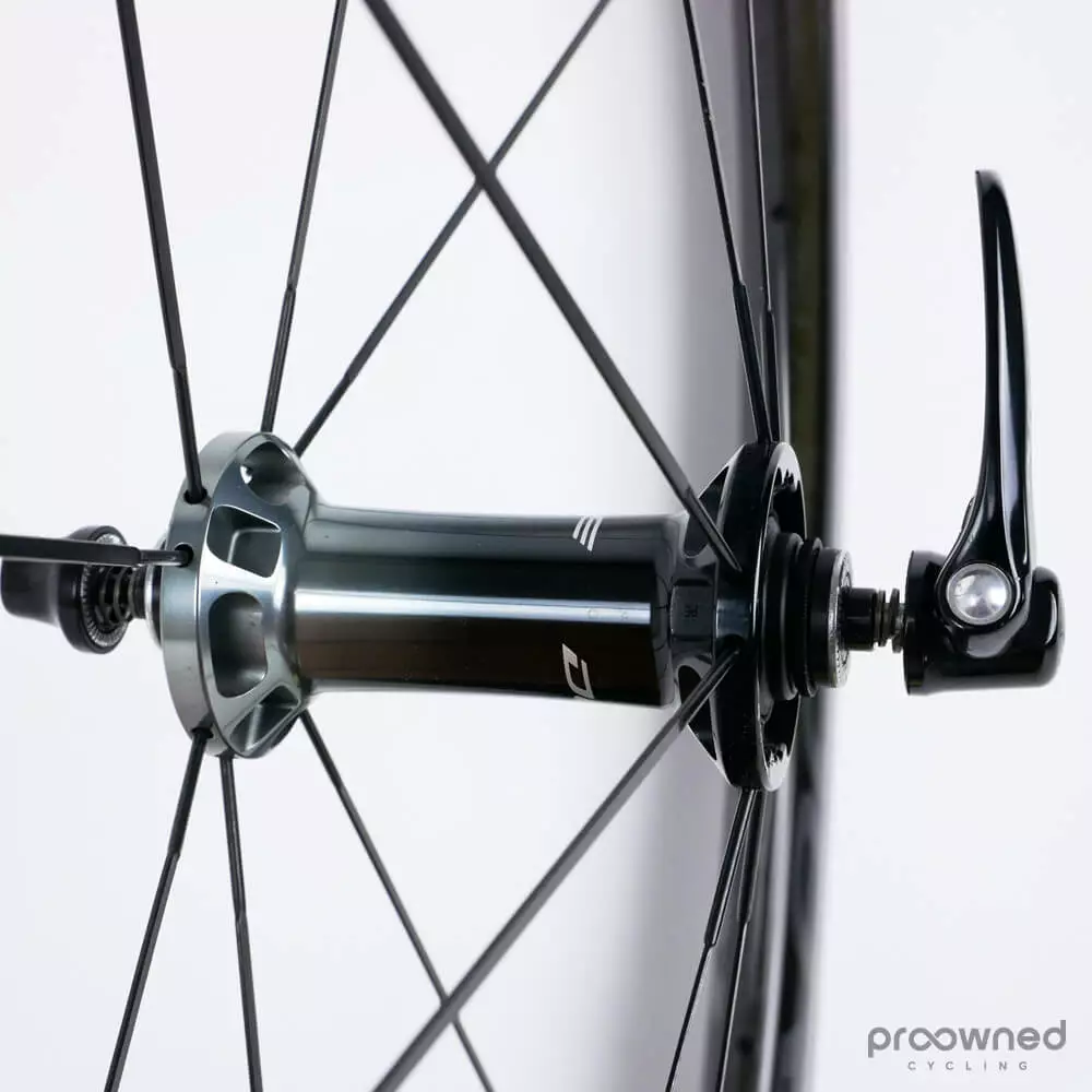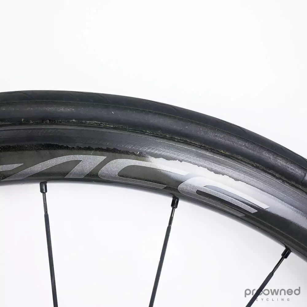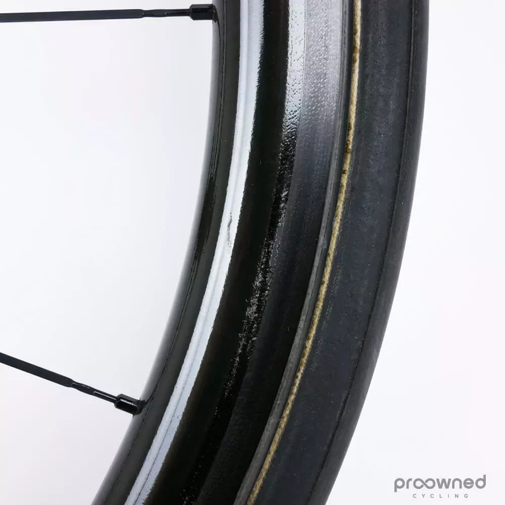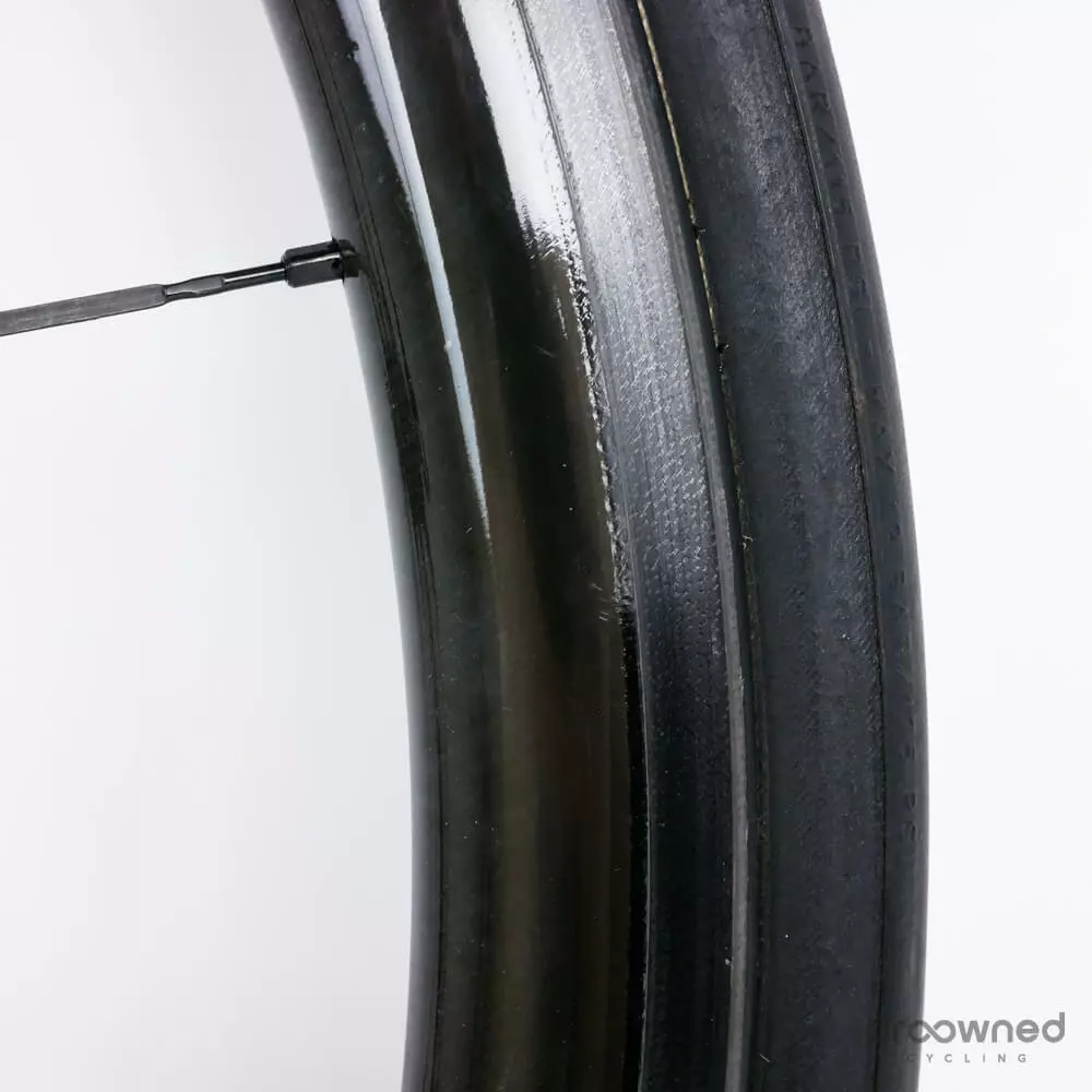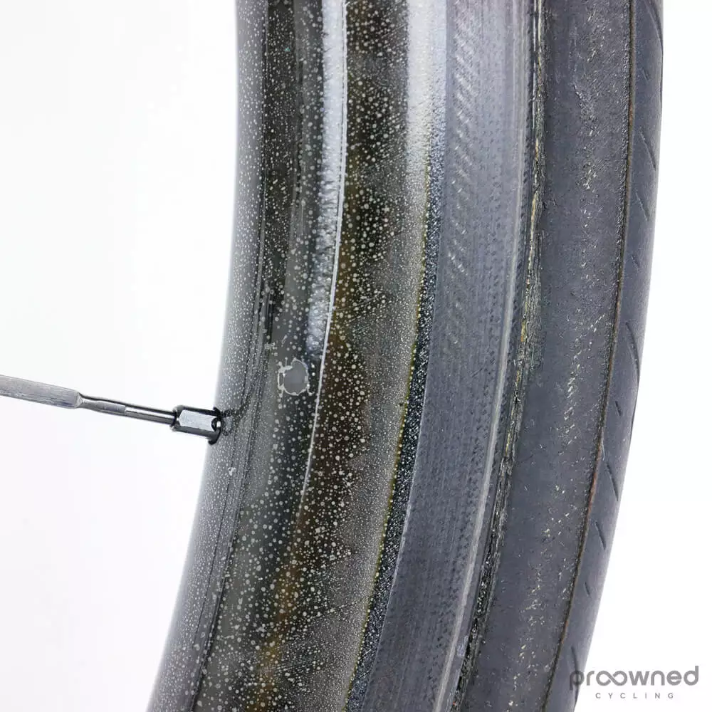 This wheelset has been used and has some race scars and scratches. However, they are still in super good condition. The bearings run smoothly and there are a lot of miles left in them. The wheels are mounted with Pirelli P Zero Velo (yellow) 25mm with slick pattern on the front and normal pattern on the rear. The tires have been used but still have many km’s left.