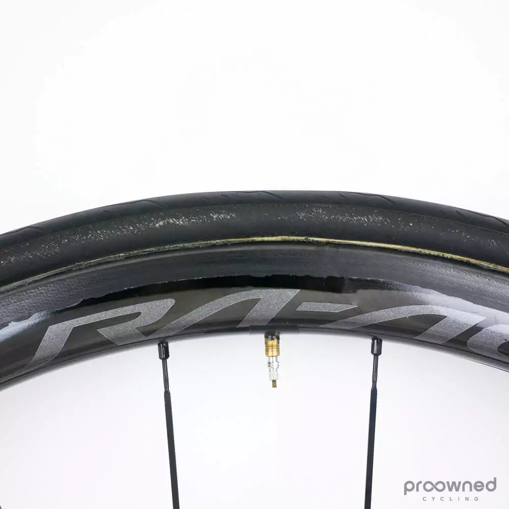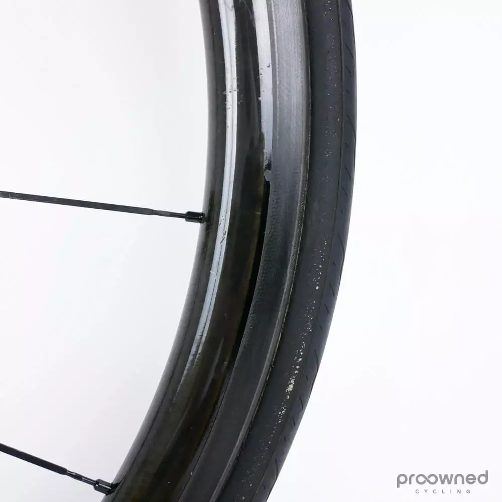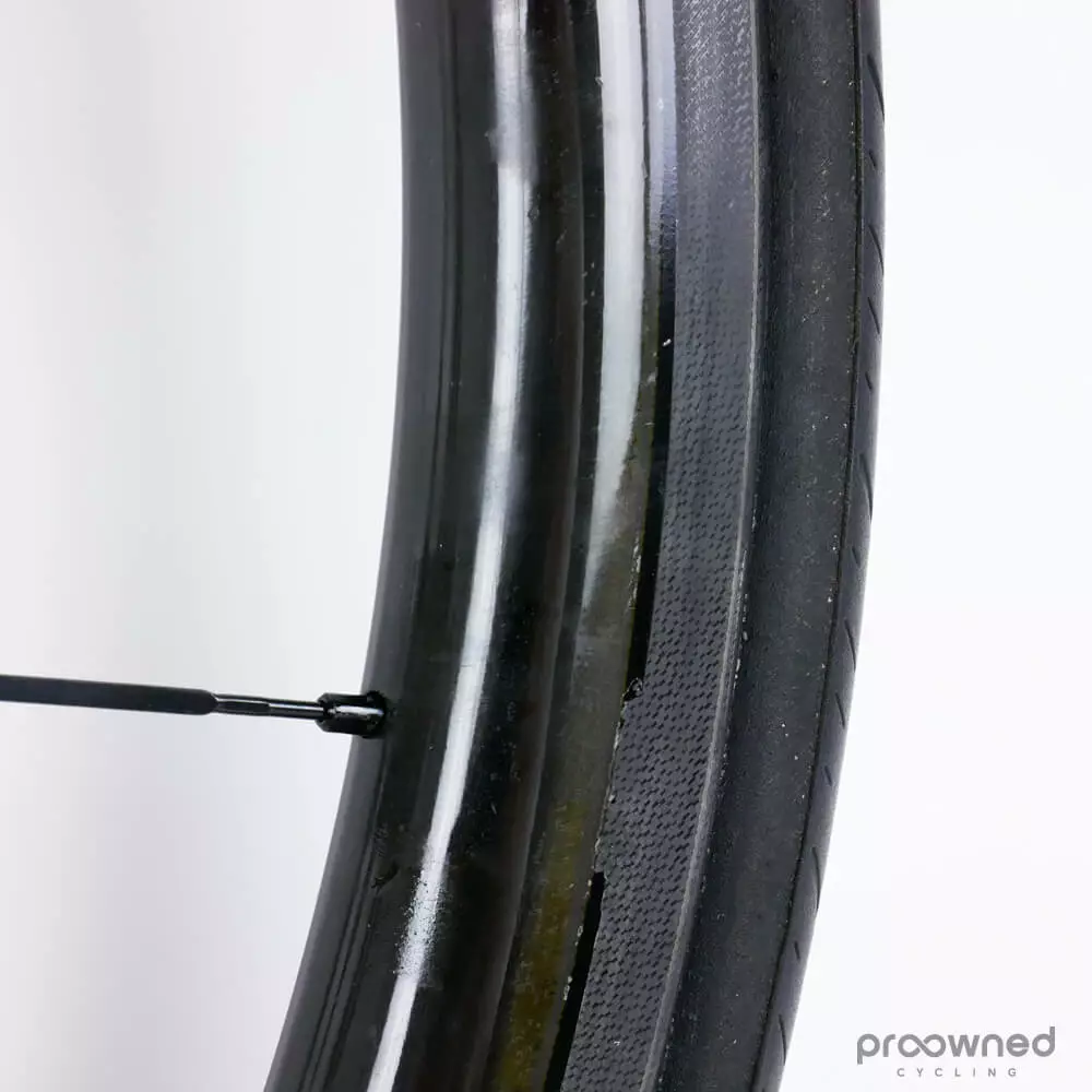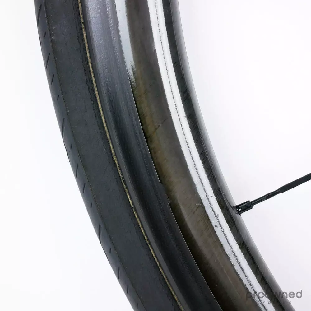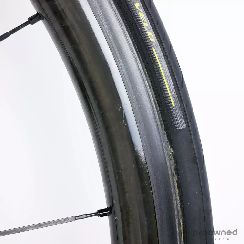 This wheelset is almost as new and has not been used a lot. There are some race scars and scratches. However, they are still in excellent condition. The bearings run smoothly, and there is a lot of miles left in them. The wheelset is mounted with Pirelli P Zero Velo (yellow) 25mm with a normal pattern. Both front and rear tyre have been used for several km’s.
