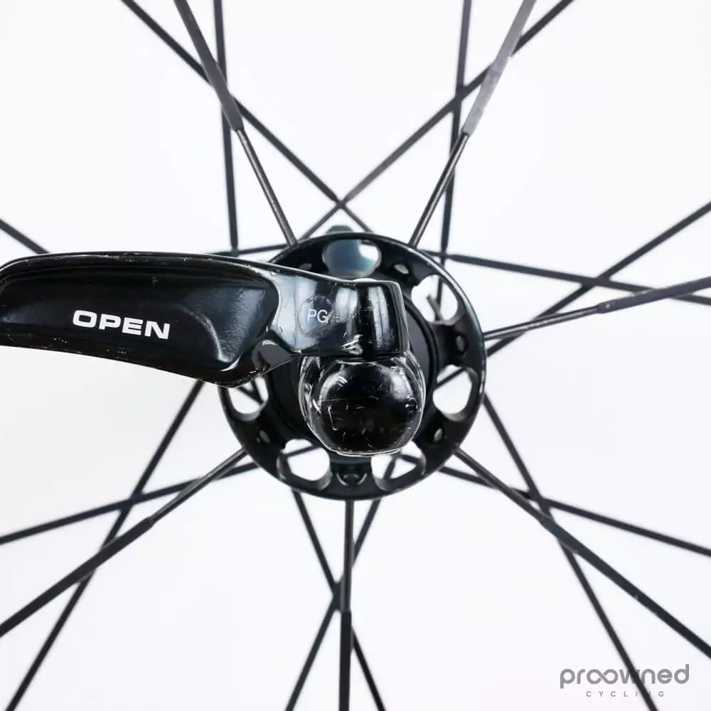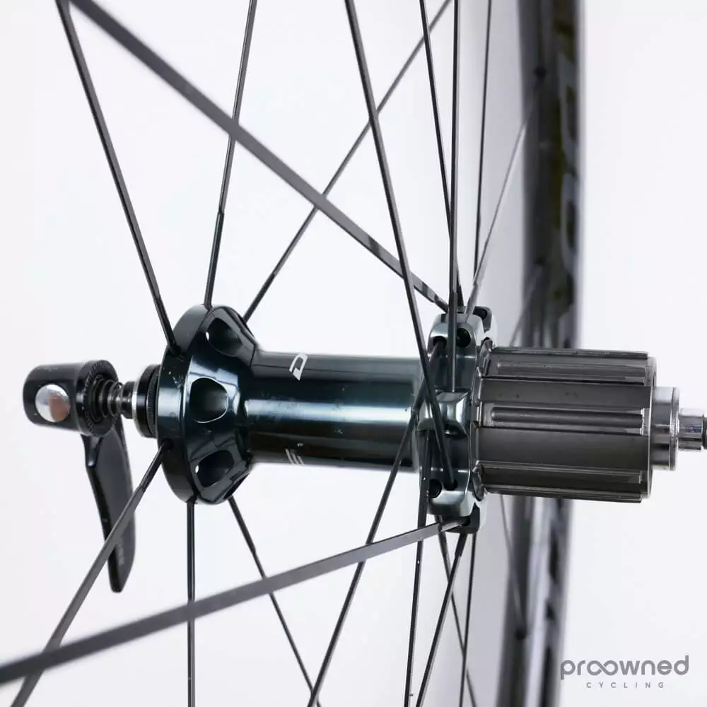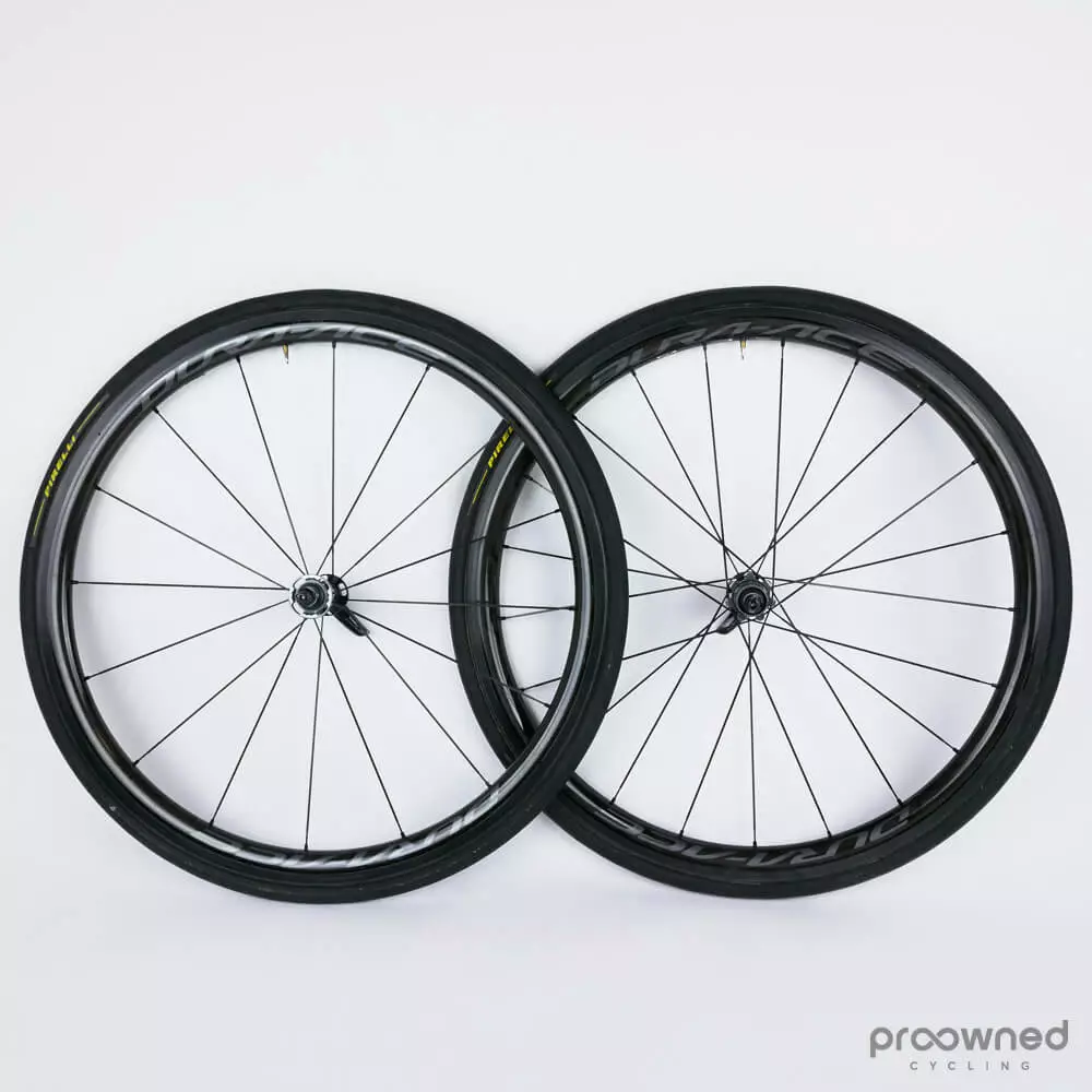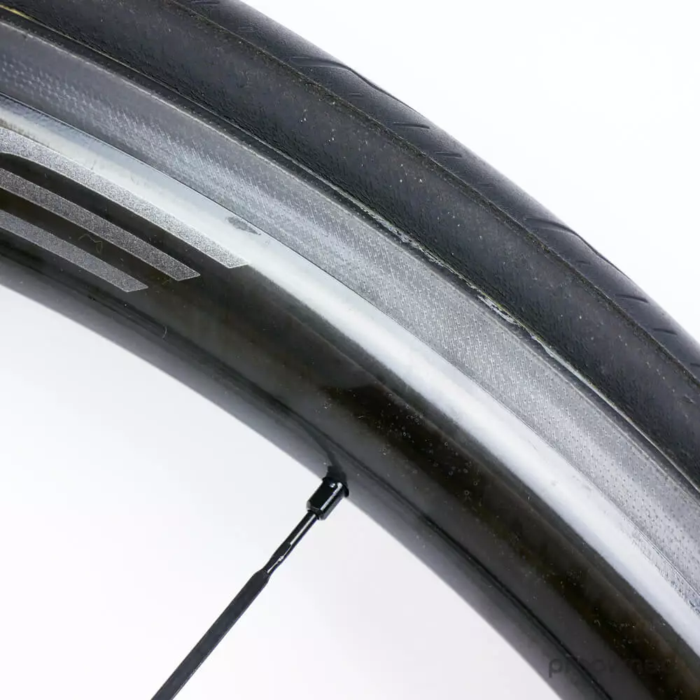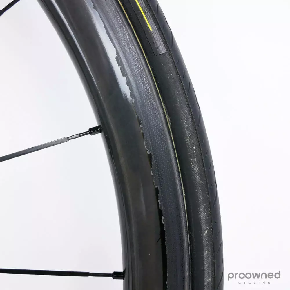 This wheelset is almost as new and has not been used a lot. There are some race scars and scratches. However, they are still in excellent condition. The bearings run smoothly, and there is a lot of miles left in them. The wheelset is mounted with Pirelli P Zero Velo (yellow) 25mm with a normal pattern. Both front and rear tyre have been used for several km’s.
