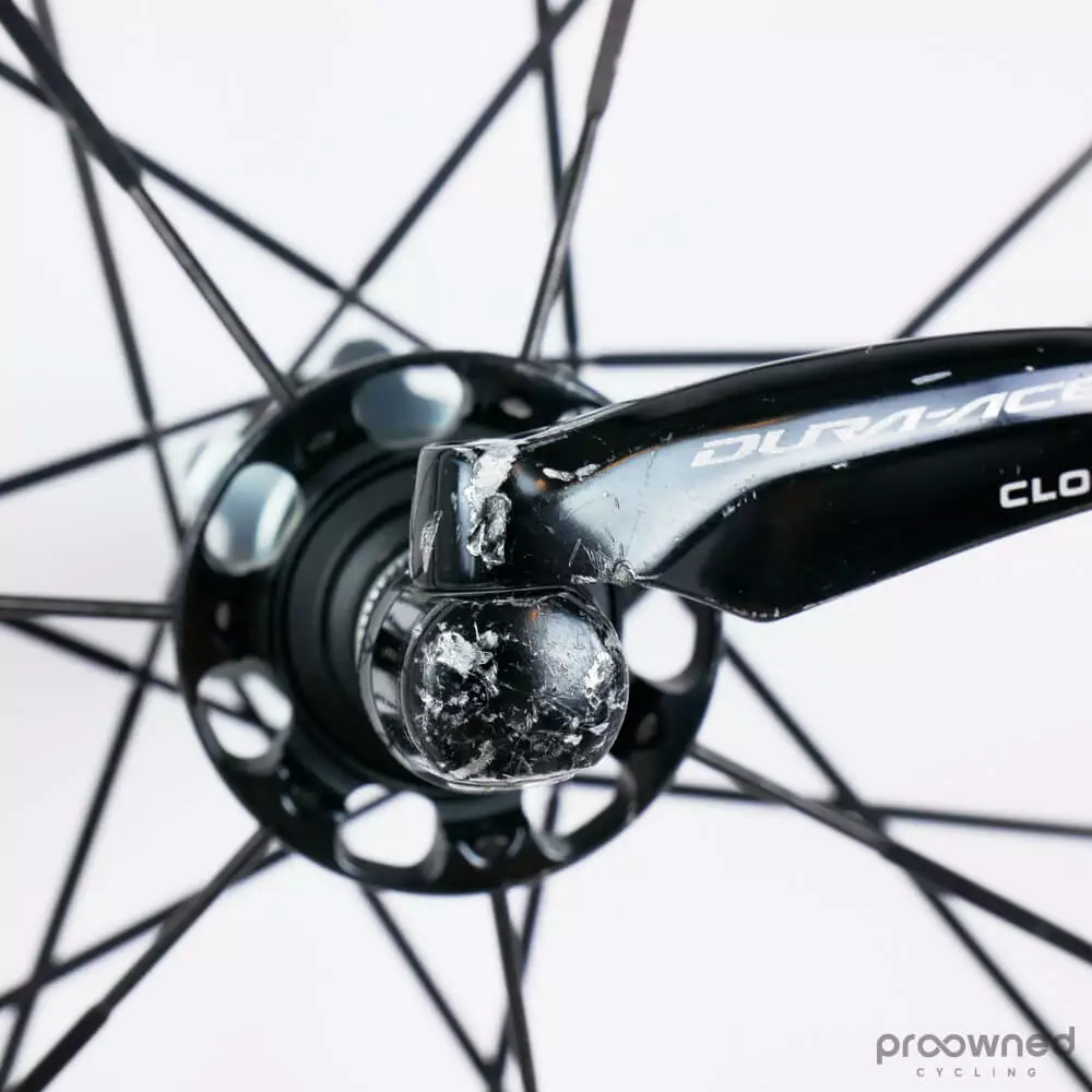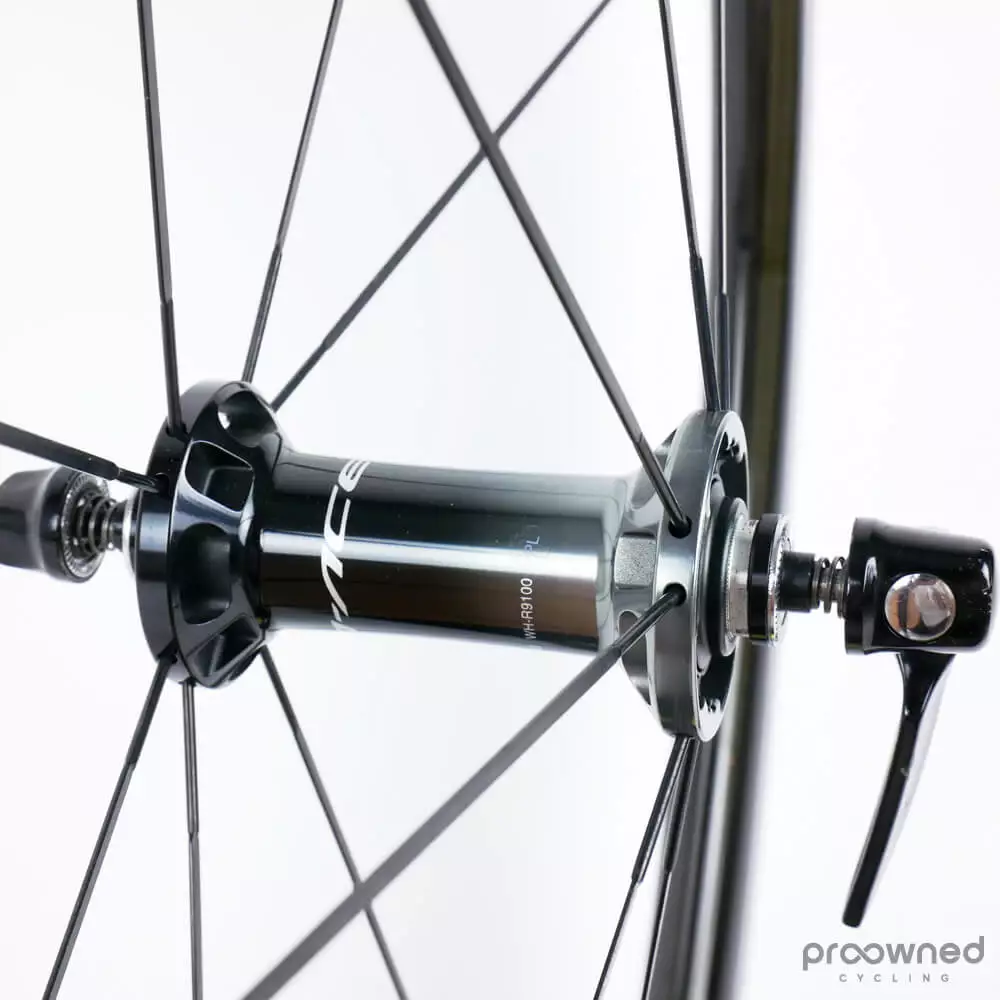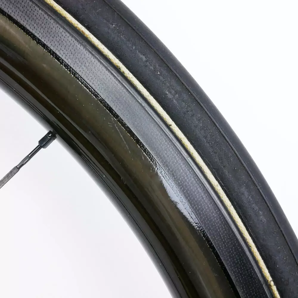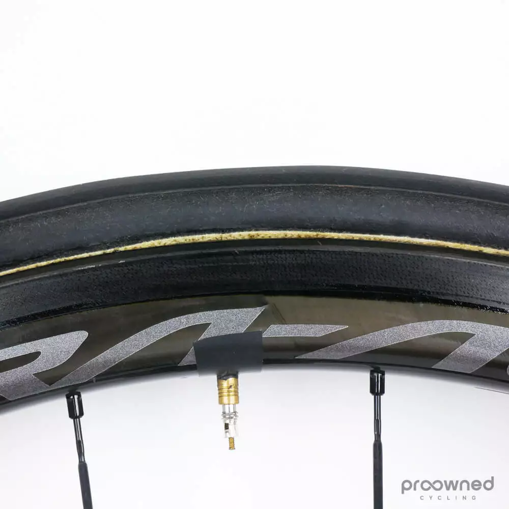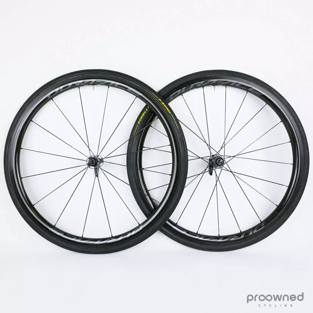This wheelset is almost as new and has not been used a lot. There are some race scars and scratches. However, they are still in excellent condition. The bearings run perfect, and there is a lot of miles left in them. The wheels are mounted with Pirelli P Zero Velo (yellow) 25mm with a normal pattern