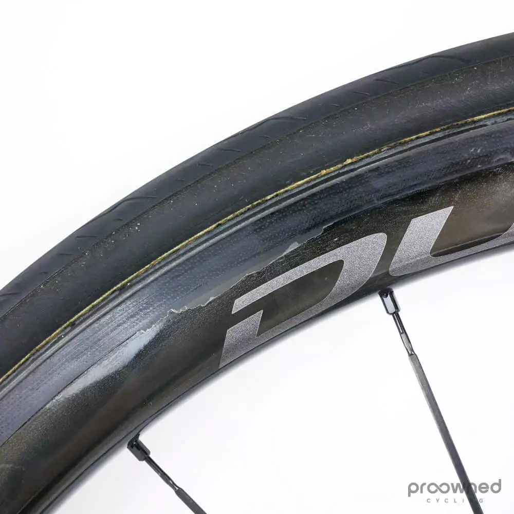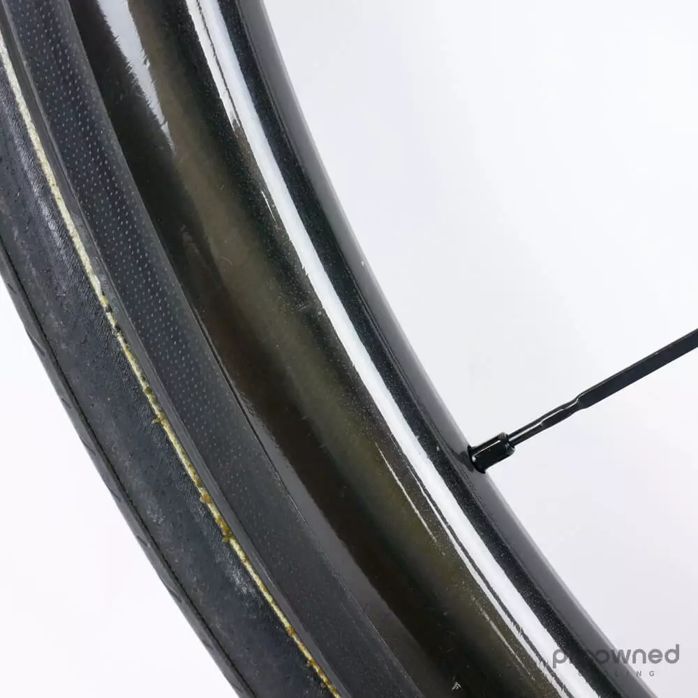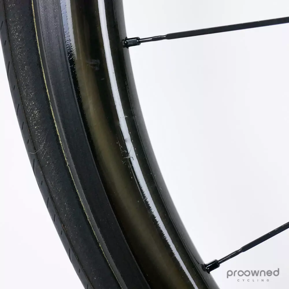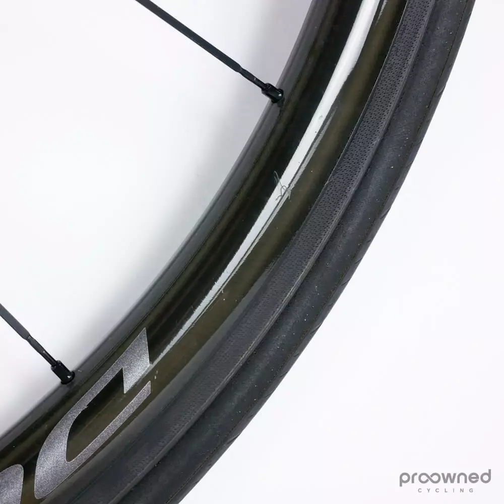This wheelset is almost as new and has not been used a lot. There are some race scars and scratches on both wheels. However, they are still in excellent condition. The bearings run smoothly, and there is a lot of miles left in them. The wheels are mounted with Pirelli P Zero Velo (yellow) 25mm with normal pattern – both tires have been used for several km’s.