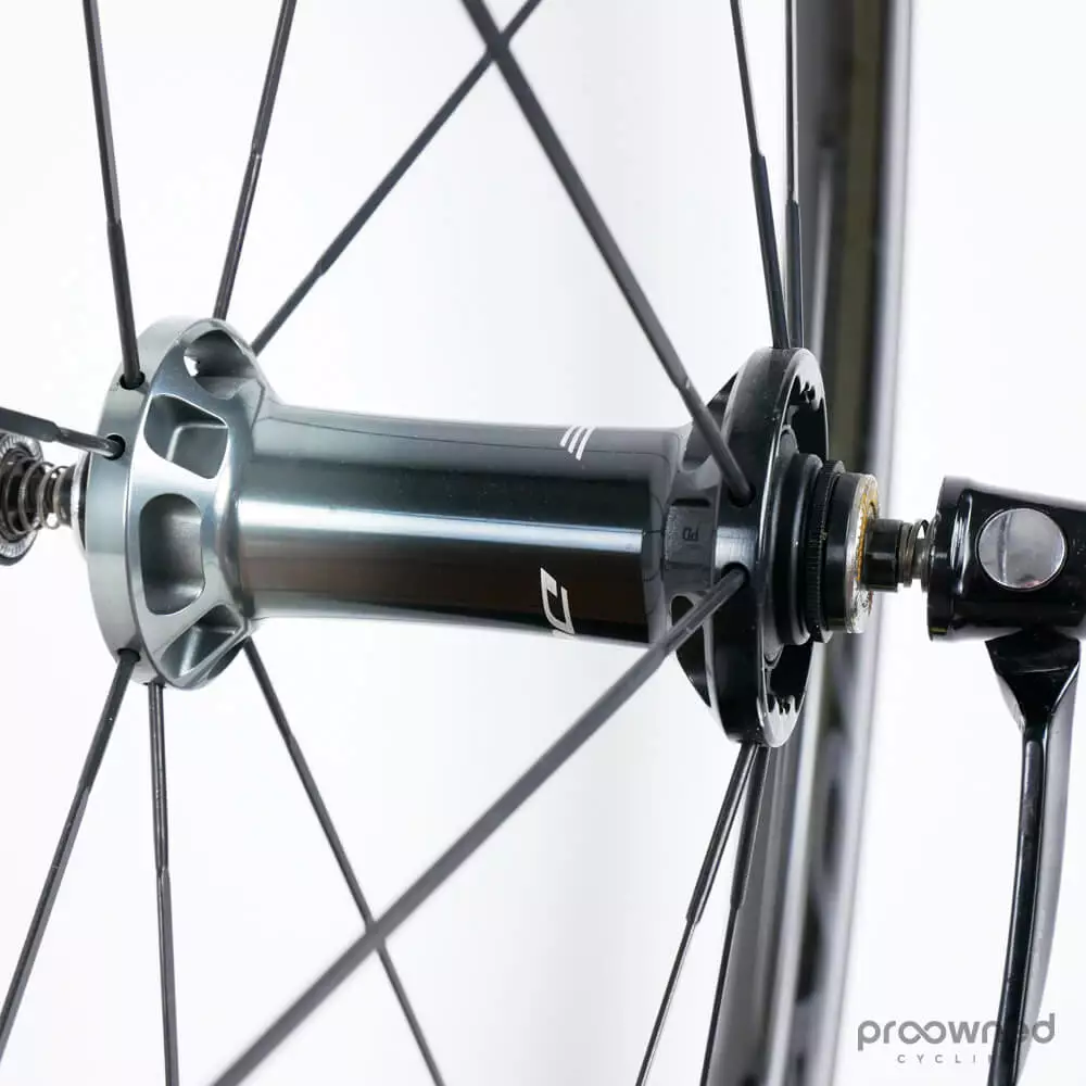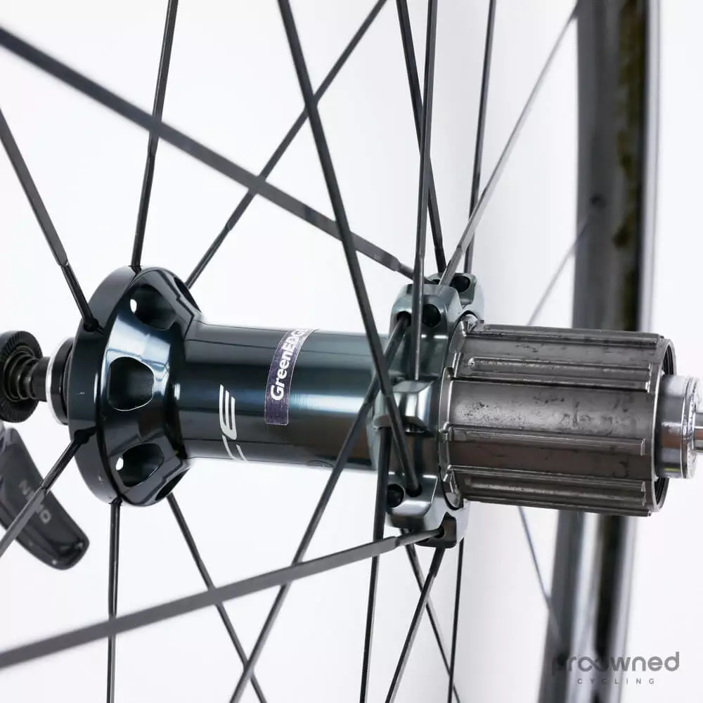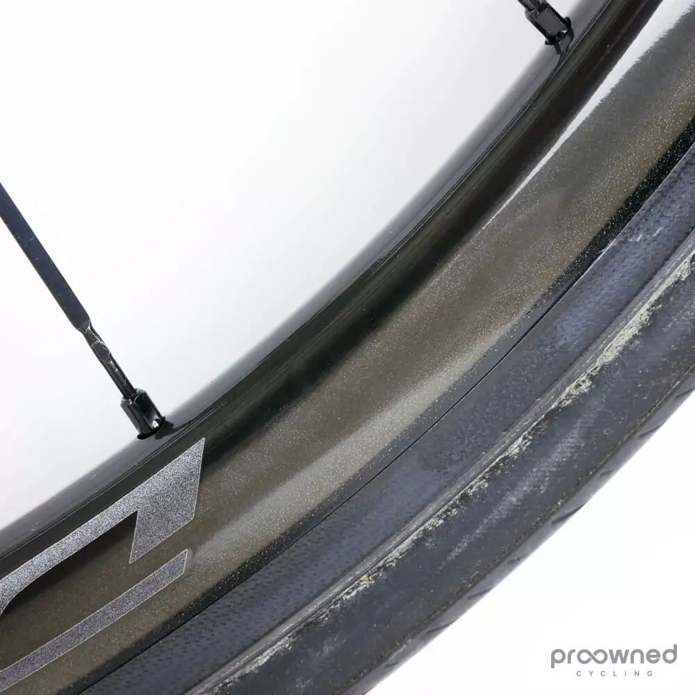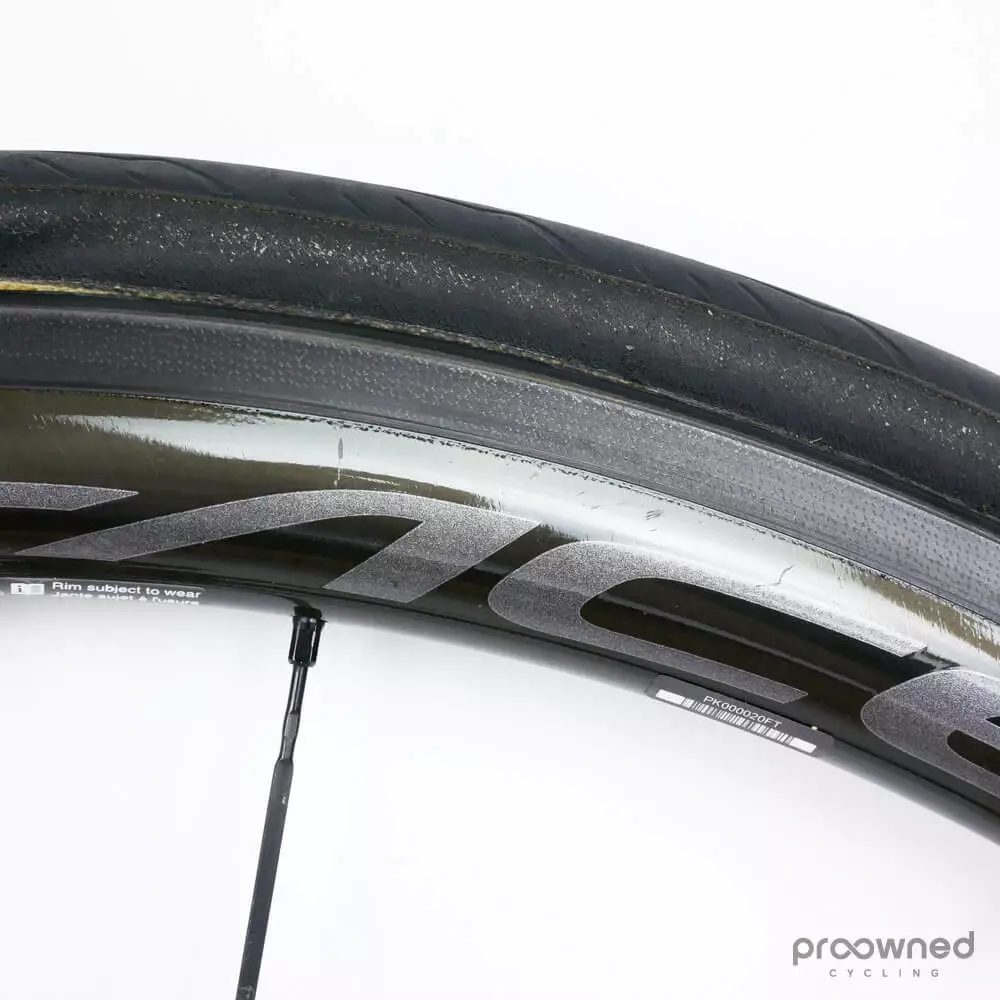 This wheelset is almost as new and has not been used a lot. There are some race scars and scratches on both wheels. However, they are still in excellent condition. The bearings run smoothly, and there is a lot of miles left in them. The wheels are mounted with Pirelli P Zero Velo (yellow) 25mm with normal pattern – both tires have been used for several km’s.